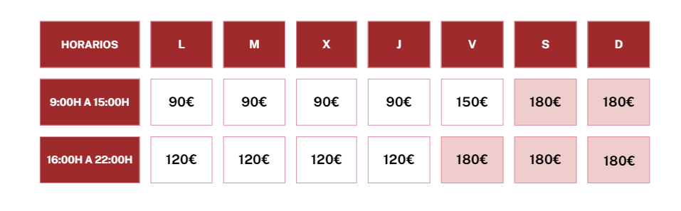 * Si durante el evento, decides quedarte más tiempo, deberás avisar que quieres horas extras (siempre que la sala no esté reservada). Las tarifas de las horas extra, se aplicarán según la tabla de Precios.